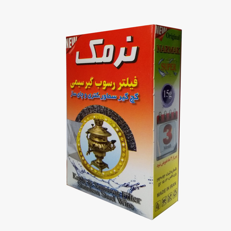 سایر توضیحات: جرم گیر سیمی نرمک از سیم استیل Stainless Steel با گرایش نیکل بالا و ضد زنگ و با آلیاژهای حساس ساخته شده که 85% گچ و املاح موجود در آب را به خود جذب می کند.
